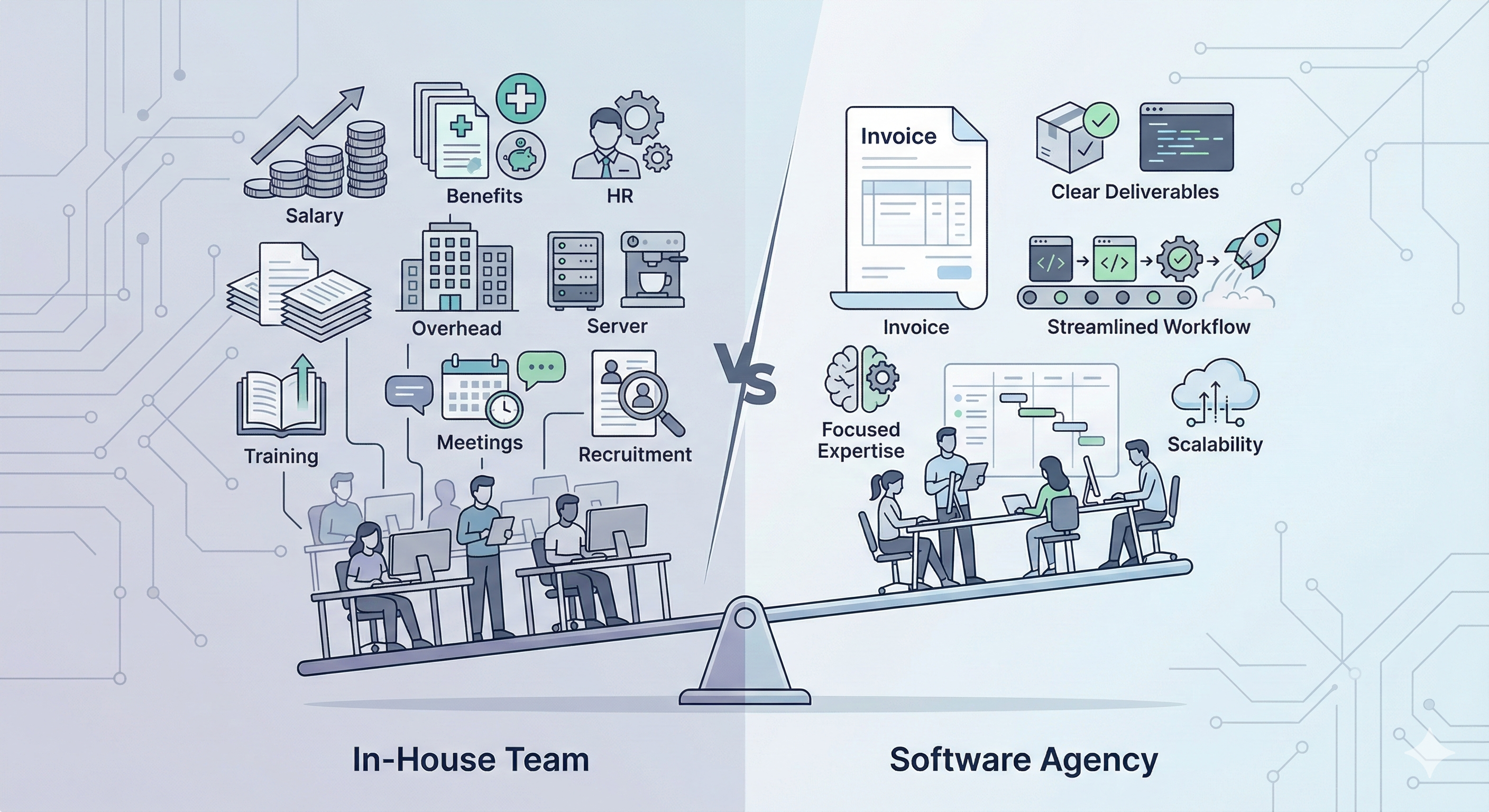 A realistic comparison of in-house development vs software agencies in 2026. Real costs, hidden tradeoffs, and when each option makes sense.